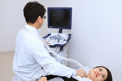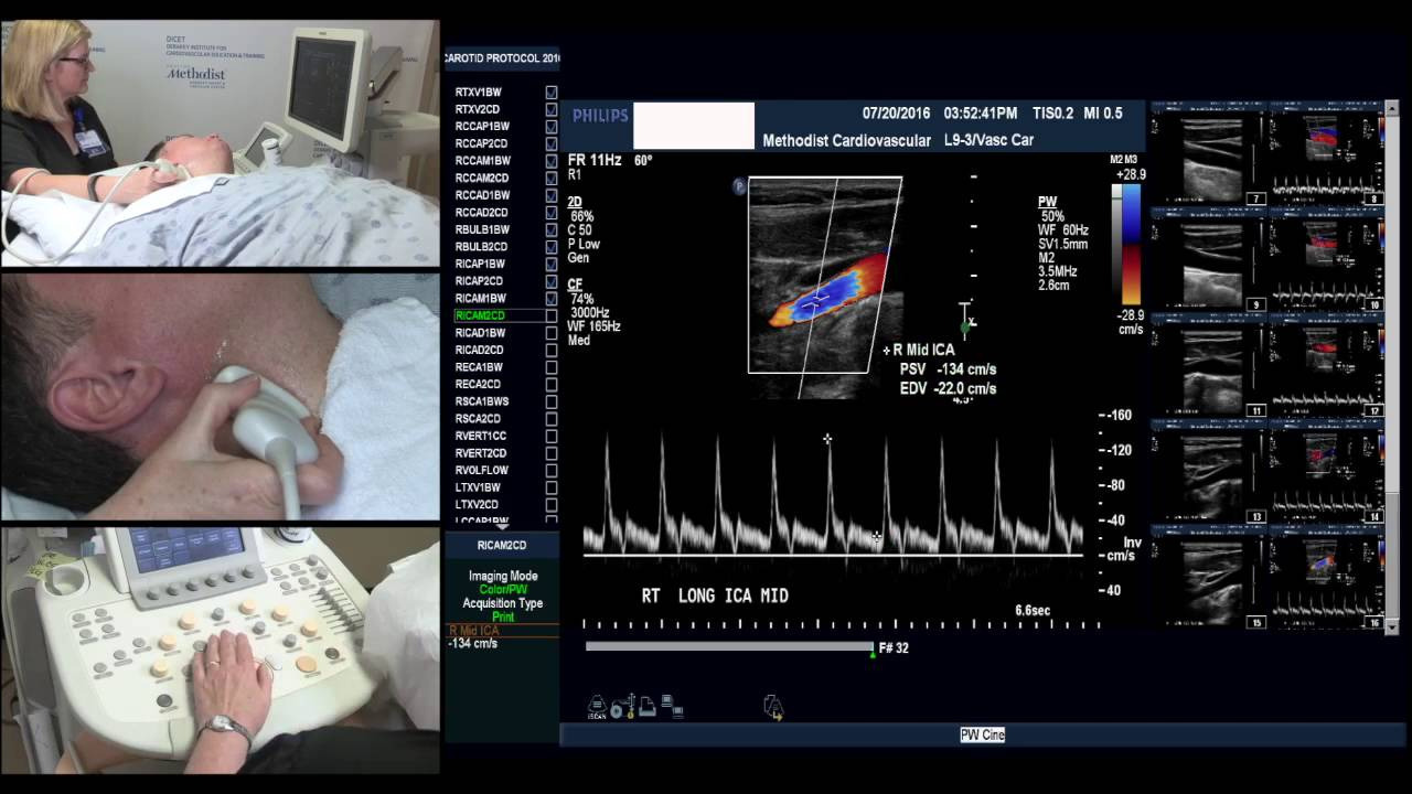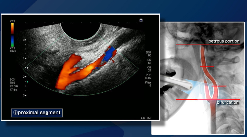 - 침대에 누워 목 양쪽에 초음파 탐촉자(probe)를 대고 관찰