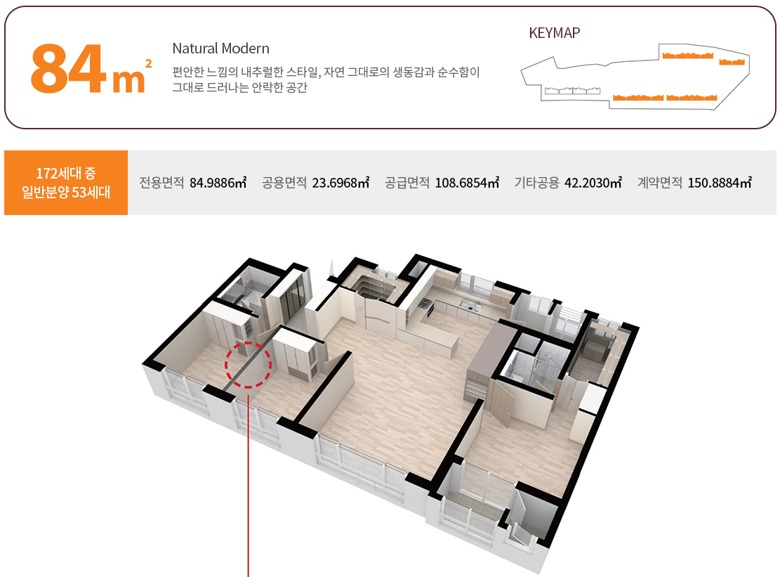 • 공급면적: 전용면적에 주거공용면적(계단, 복도, 엘리베이터 등 공동으로 사용하는 공간)을 더한 전체 면적을 의미합니다.