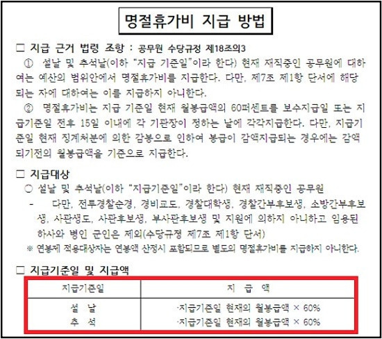 즉, 추석 명절 기준일(예: 9월 16일)에 재직 중인 공무원이라면 자동적으로 지급 대상에 포함되며, 봉급액(기본급)의 60%가 지급됩니다.