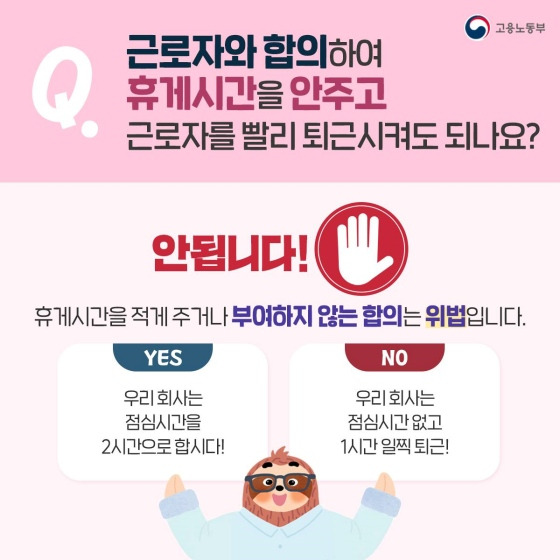 - 근로시간을 위반하거나 휴게시간을 충분히 제공하지 않을 경우, 사용자는 시정명령 및 과태료 처분 대상이 될 수 있습니다.
