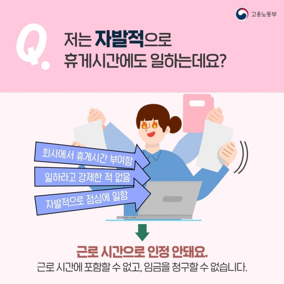 - “근로자가 자유롭게 휴식을 취할 수 없는 점심시간은 휴게시간이 아닌 근로시간으로 보아야 한다.”(고용노동부 훈령 해석 사례)