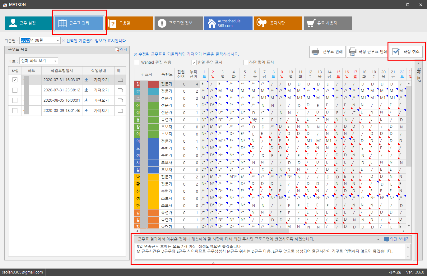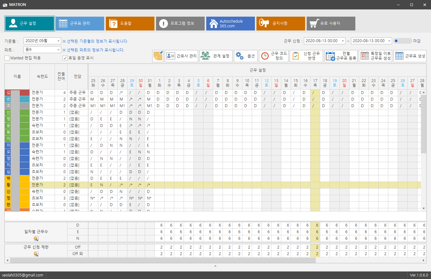 대학 종합 병원 간호사 근무표 3교대 간호사 스케줄 작성 프로그램 무료 다운로드 메이트런 오토스케줄 365