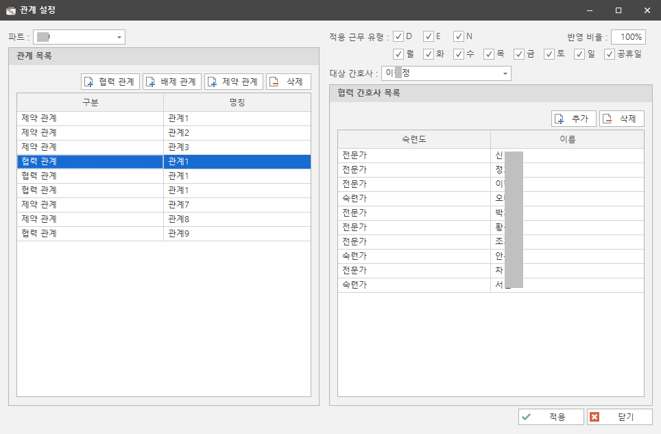 협력관계 설정에서는 대상간호사와 목록 중 간호사 1명은 같은 듀티에 들어가도록 근무표를 짜줍니다.
