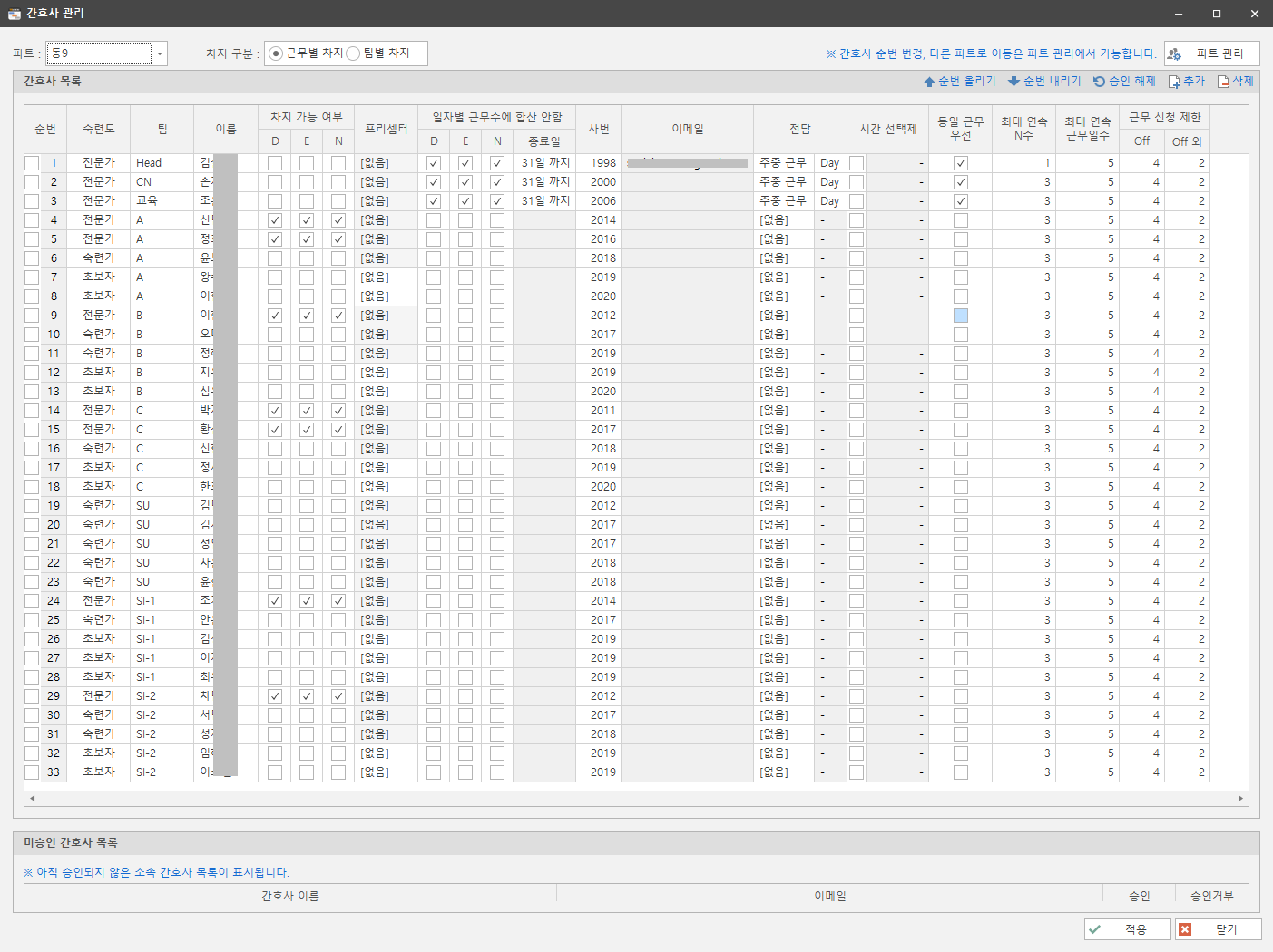 이 곳에 간호사 숙련도, 사번 이름, 팀, 전담 업무, 동일근무 우선 방식, 최대 연속 근무일수 등을 설정합니다.
