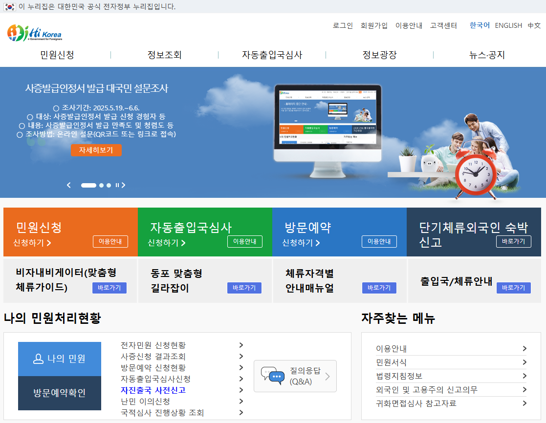 하이코리아(Hi Korea) 홈페이지는 법무부 출입국관리사무소가 제공하는 공식 온라인 플랫폼으로, 외국인뿐 아니라 내국인도 다양한 출입국 관련 정보를 얻고 민원 업무를 편리하게 처리할 수 있도록 지원하는 웹사이트입니다.