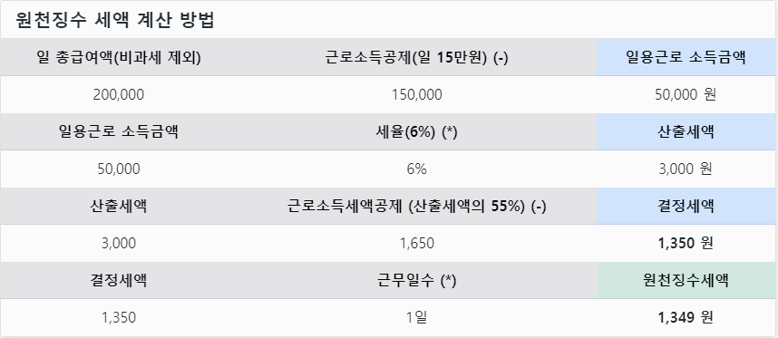 - 적용 기준: 일일 총 급여액이 187,000원 이하일 경우 원천징수 세액이 없습니다.