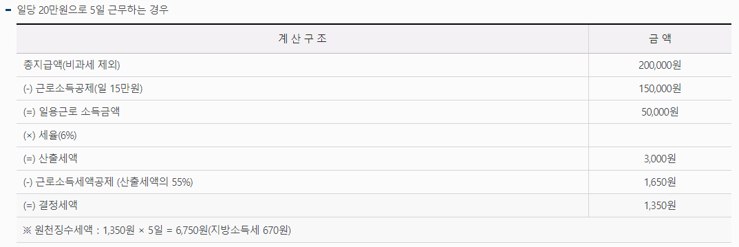 - 적용 기준: 일일 총 급여액이 187,000원 이하일 경우 원천징수 세액이 없습니다.