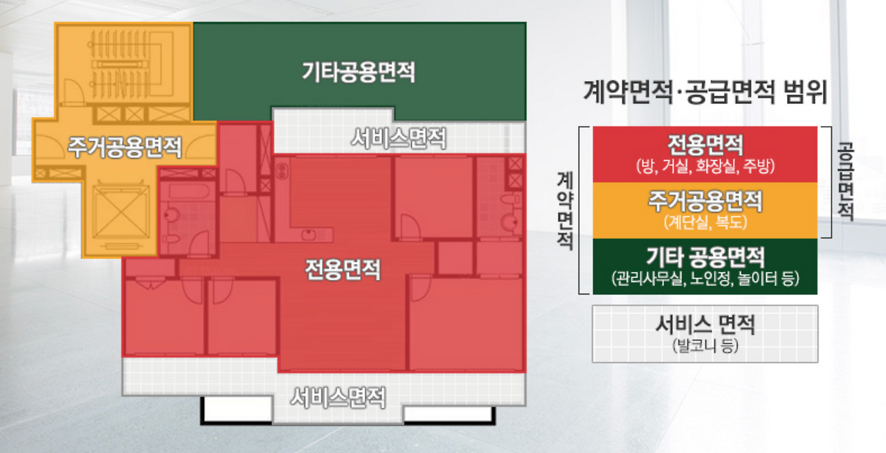 - 계약면적: 공급면적 + 기타 공용면적(지하 주차장, 관리시설 등)