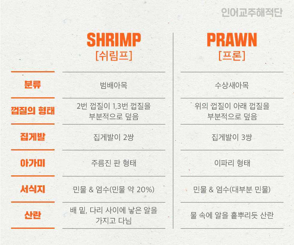 프론, 쉬림프, 새우, 프라운과 쉬림프의 차이, 알의 부화 방식, 껍질의 구조, 진화론적 차이, 대하, 부채새우, 로브스터