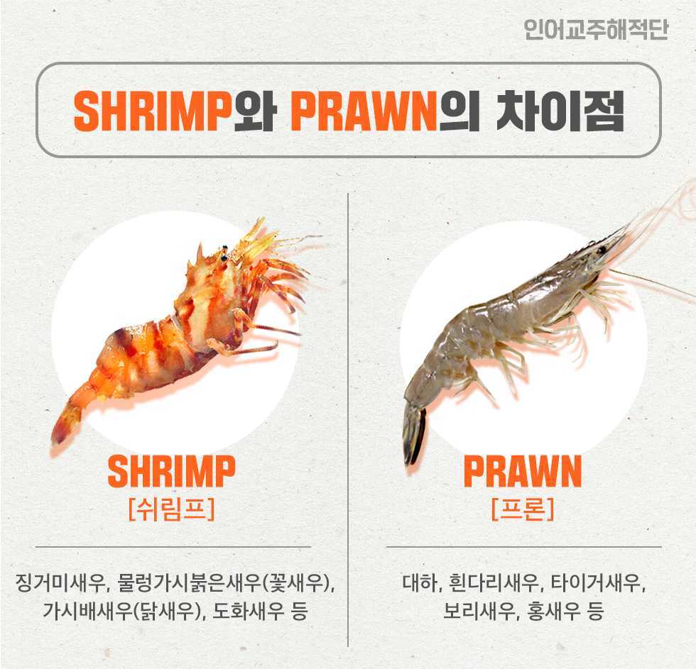 일반적으로 해외 레스토랑에서 메뉴를 주문할 때 쉬림프는 상대적으로 작고, 프라운은 상대적으로 큰 새우를 지칭합니다. 이는 사람들이 눈으로 봤을 때 쉽게 구분할 수 있는 가장 직관적인 방법이기도 합니다. 하지만 이것만으로 두 새우의 차이를 설명하기에는 부족합니다.